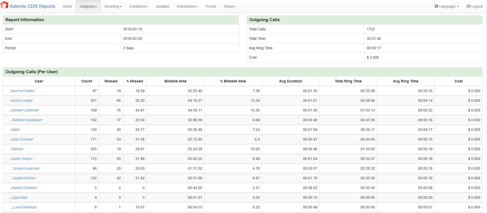 El Asterinic CDR de Asternic le permite ejecutar informes sobre sus registros de detalles de llamadas desde el PBX de Asterisk, pero con un giro diferente. En lugar de una gran pila de registros no organizados, los verá agrupados por usuario y dirección de llamada. Sabrá cuántas llamadas ha hecho o recibido cada uno de sus usuarios / extensiones, con duración de llamadas, tiempos de timbre. También tendrá un enlace para descargar o escuchar las grabaciones si están disponibles en su sistema. Todo desde su navegador web, sin la necesidad de instalar nada en el lado del cliente.